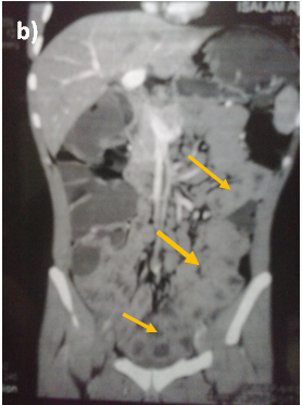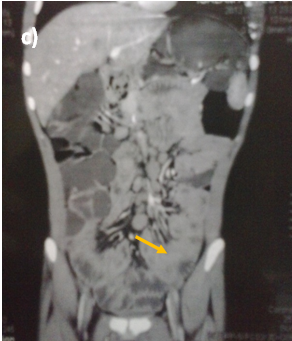 Figure 1 C.T. Enterography of the patient that showed diffuse uniform thickening of the small bowel loops mainly involving the ileum with no focal thickening or masses.