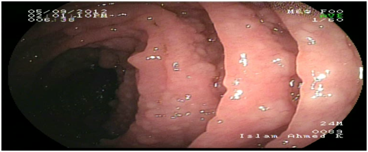 Abdominal ultrasound showed uniform circumferential mural thickening of the small bowel loops, so we proceeded to C.T Enterography. As shown in Figure 1, there is diffuse uniform thickening of the small bowel loops mainly involving the ileum with no focal thickening or masses. Then upper endoscopy and colonoscopy were performed to the patient and they showed multiple tiny rounded nodules at the terminal ileum that were biopsied and revealed non-specific inflammation free of granuloma or malignancy. Then we proceeded to double balloon enteroscopy which was done by an over tube double balloon Fuji series endoscopy, which proceeded to about 200cm from the duodenal bulb. Double balloon endoscopy as shown in Figure 2, showed numerous visible mucosal nodules measuring few millimeters in diameter involving the whole part of the small intestine examined which were biopsied. Histopathology revealed chronic inflammatory enteritis with foci of lymphoid aggregates with no atypia or malignancy (Table 1).