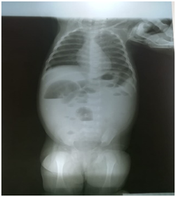 Systemic examination revealed that the patient was dehydrated, lethargic and tachycardic. Urgent resuscitation with I.V. normal Saline (10mg/kg) was then started with marvellous improvement of her general condition. The nasogastric tube drained 100ml of bilious suction. Chest examination showed equal bilateral air entry with no adventitious sounds. There was no obvious spinal nor other associated congenital anomalies.