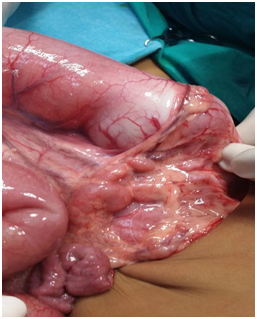 Owing to the marked abdominal distention; laparoscopy was not feasible and the decision was to proceed with lower midline exploratory laparotomy. Exploration revealed a cystic lesion on the mesenteric side of the cecum. (Figure 2).