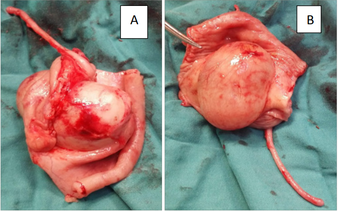 The 8cm excised segment was sent for the histopathological examination which report the presence of a cystic lesion at the mesenteric border of the cecum measuring 3 cm×2.5cm. (Figure 3A, B).