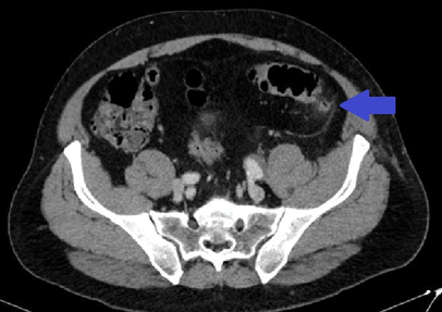 Epiploic appendagitis (EA) is a rare, benign, and local inflammatory disease involving fatty outgrowths on the surface of the colon, known as epiploic appendages.1 This medical condition often goes unnoticed, because of the low specificity of its symptoms. It usually presents with lower abdominal pain, so the differential diagnosis is usually made with other entities such as acute appendicitis and diverticulitis. The increased availability of imaging studies like ultrasound and computed tomography (CT) in emergency services has contributed to the increase in the diagnosis of this disease. We present a typical case of the pathology for acknowledgement of this not common disease.