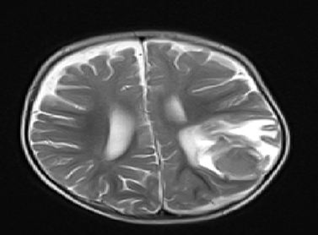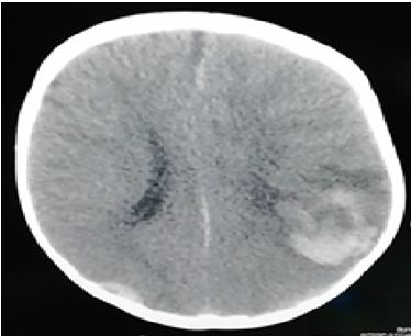 On examination, He looked well but pale. His weight was 11kg (normal), the length was 76cm (normal) and his head circumference was 47cm (normal). Cardiovascular, respiratory, and abdominal examinations were normal. The blood pressure (BP) was 100/60mmHg, oxygen Saturation (Sao2): 98%, the pulse rate was 110/min, body temperature was 37⁰C and respiration rate was 40/min. His spine and joints appeared normal, and there were no unusual birthmarks. Neurological examination showed normal cranial nerves and normal posture, tone, power, and reflexes in the upper and lower limbs. There were no focal neurological signs and no other signs. Funduscopic examination showed Roth's spots spread with cloudy papilla borders and ulceration vessels with flame bleeding. Contrast-enhanced computed tomography (CT) of the brain showed right intra-cerebral bleed extending from the parietal lobe to the occipital region with a shift of the midline (Figure 1). Laboratory results were as in Table 1.
