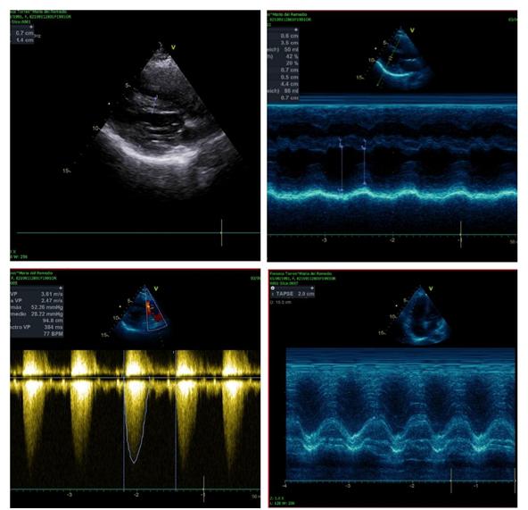 Figure 4 Echocardiogram 03-06-2020. Non-dilated non-hypertrophic left ventricle, without intracavitary thrombi, without alterations in contractility, with a moderately depressed LVEF of 42%, due to teicholz, moderate diastolic dysfunction due to a type 2 pattern. Undilated right ventricle hypertrophy, without intracavitary thrombi, preserved systolic function, with TAPSE of 20 mm, ventricular septal defect with an aortic thrust of 30%, in fundibular pulmonary stenosis with a maximum gradient of 52 mmHg, medium 28mmHg.