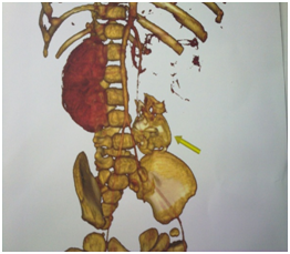 Clinical examination of the patient revealed soft abdominal mass occupying the left hemi-abdomen. Ultrasonography exam had shown a left hydronephrosis associated with polycystic mass measuring 10x15cm containing multiple calcifications. CT scan exam revealed a left hydronephrosis with a thin renal cortex associated with a well-capsulated and heterogeneous mass containing multiple calcifications, measuring 82x66x59mm, localized in the retro-peritoneum space and adherent to the lumbar vertebral column and the left iliac crest, pushing away the aorta and the inferior vena cava to the right side of the abdomen and compressing the left ureter (Figure 1). We suspected with teratoma. Contrast multislice computed tomography of the abdomen was done and it shew a bony mass lying on the left iliac crest and is adherent to the fifth lumbar vertebra and it receives blood perfusion through small vessel arising from the aorta (Figure 2). On surgical laparotomy and exploration using transverse left infra-umbilical incision, we found a large retro-peritoneal cystic mass adherent to the 5th lumbar vertebra and the left iliac crest, pushing the aorta and the inferior vena cava to the right side. There was no adherence with the left kidney but the ureter was compressed causing hydronephrosis.