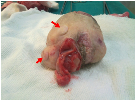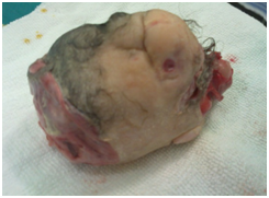 We exteriorized the entire mass carefully. The macroscopic inspection shew a mass weighting 500g covered with fine-hear-bearing-skin, two buds of limbs were seen and a cephalic prominence was noted with primary nose and lips (Figure 3,4). By searching in the literature we found similar cases, so that the diagnosis was made based on the twin gestational history of the mother initially, radiological findings and the macroscopic exam of the mass.