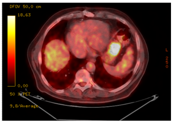A 76year old man was admitted due to upper gastrointestinal bleeding. He was hemodynamically stable. Physical examination was unremarkable except for melena on rectal examination. Nasogastric tube showed clear gastric content. There was no history of recent abdominal pain, weight lost or vomiting. On admission hemoglobin level was 8.9g/dl. All other blood tests including coagulation profile were normal. After initial resuscitation, he underwent urgent Gastroscopy in which a sub mucosal 3cm ulcerated mass was identified at the greater curvature without evidence of active bleeding. Bleeding ceased spontaneously. Further evaluation was performed. Endoscopic ultra sound showed a 3cm mixed echogenicity mass arising from the sub mucosa without lymphadenopathy. Biopsies were not taken. An abdominal computer tomography confirmed the diagnosis of a 3cm sub mucosal lesion with peripheral enhancement after injection of contrast material. PET CT showed a pathological uptake of FDG in the gastric tumor only (Figure 1) and a preoperative diagnosis of GIST were made.