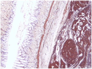 Under general anesthesia a laparoscopic exploration was performed. A 3cm tumor was found at the posterior wall of the stomach (Figure 2). There were no other pathological findings during the exploration of the abdomen cavity. A wedge resection of the tumor was performed using laparoscopic staplers. The patient had uneventful recovering period and was discharged 5days after surgery. On slides taken from lesion showed the round cells with small uniform nuclei, without nuclear pleomorphic and no mitotic figures. The distribution of round glomus cells around the open vascular lumen is a key to the pathology diagnosis. The lesion was positive for alpha-smooth muscle Actine (alpha SMA), Calponin and negative for CD-34, C-KIT and CK MNF116. The proliferating marker showed very low mitotic rate, less than one per 50 HPF. The histological examination and immunohistochemical stains confirmed diagnosis of gastric glomus tumor (Figure 3). The surgical resection margins were free of tumor.