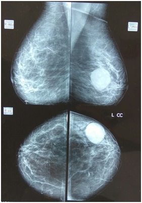 A forty years female presented with history of lump in left breast for last 9months. The lump was painless initially but for last 3months, this patient started having discomfort in the breast. The discomfort was not related to menstrual cycle. On examination there was 10x10cm lump in the left breast having smooth surface and non tender to touch. The consistency was firm and this left breast lump was freely mobile. On clinical examination this left breast lump appeared to be benign solid tumor. The mammography was done in this patient and diagnosis of benign mammary swelling was given (Figure 1). The ultrasound of the breast revealed a large size 10x10cm cystic swelling. This cystic swelling did not contain any solid tissue in it and surrounding tissue was normal. The diagnosis of giant simple mammary cyst was given.
