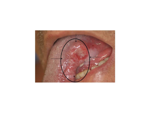 Figure 1 Example of a tumor on the left side face of the tongue, the black marks indicates the site of peri tumoral injection of drug.