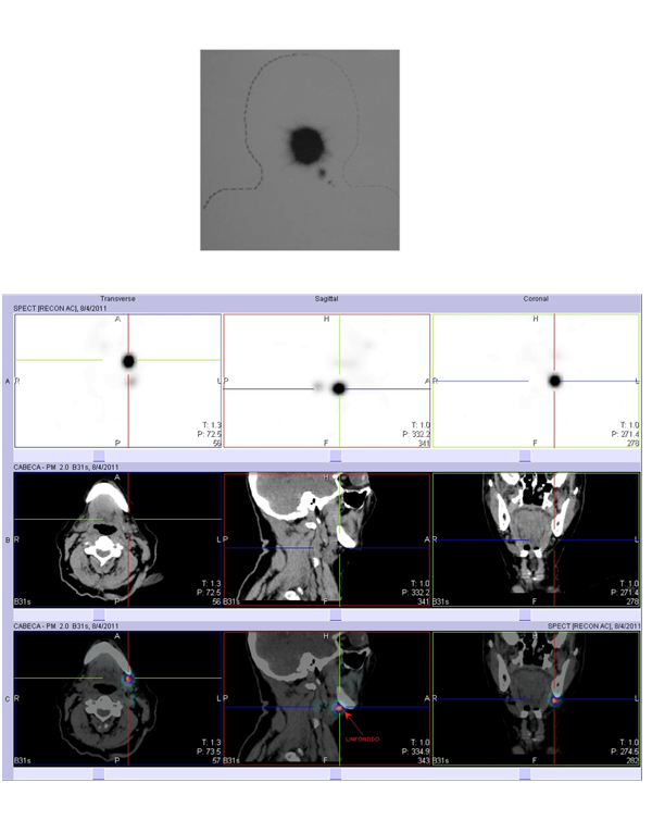 Squamous cell carcinoma (SCC) of the head and neck, spread preferably via the lymphatic system to the cervical lymph nodes (LN) and controversy still remains about the best techniques to determine which patients actually have cervical lymph node metastases.1 Clinical examination and radiological techniques are relatively inaccurate, with about 30% false negatives and false positives in the determination of the presence of cervical lymph node metastases.2–10 The only accurate method for staging the neck is still histopathological examination of the surgical specimen after a neck dissection.11 The upper aerodigestive pathway cancer, surgical treatment for the patient's neck is determined according to their risk for occult metastases. In patients whose tumors possibility of greater than 20% lymphatic metastasis is required neck dissection, even with no palpable lymph node metastasis, due to the benefits in patient survival in 11% to 14%. This probability varies according to the clinical stage of the tumor. However, the risk of lymph node metastasis of at least 20% justifies the neck dissection in all patients with this risk, many of the surgical specimens up to 80%, will be histopathologically negative. In the field of cutaneous malignant melanoma, a similar debate has been centered on research and treatment of regional lymph nodes and in this respect, the research technique and sentinel lymph node biopsy (SLNB) is embedded.12 In this technique, a radiocolloid is injected around a tumor or at the site of previous excision. This radiopharmaceutical is drained for the first chain of lymph nodes, this called SLN. The use of preoperative lymphoscintigraphy and "gamma probe" (GP) intraoperative help in tracking radioactive SLNB that may contain microscopic tumor deposits.13 Using this technique in patients with malignant melanoma, it was found that it is highly unlikely that patients with no palpable lymph node disease and SLN free of metastatic disease have metastatic disease in other lymph node groups.14