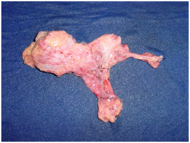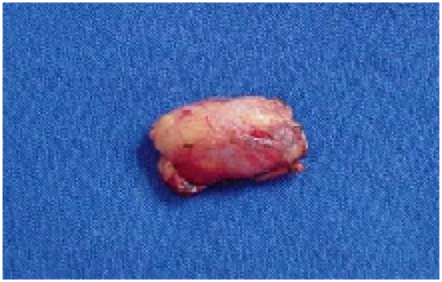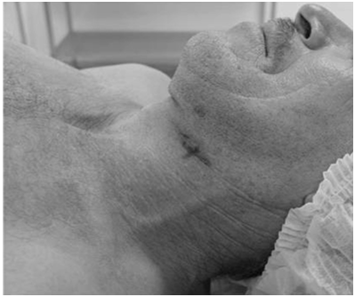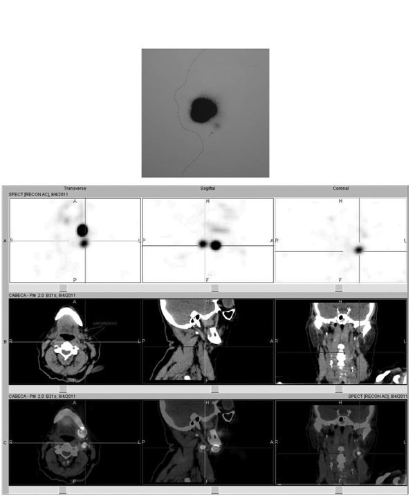It was taked care to prevent inadvertent leakage of colloid in the mouth. Static images were taken in lateral and anterioposterior projections (Figures 2) (Figure 3) and radioactive lymph nodes were marked with ink in the skin (Figure 4). Next, the primary tumor was resected. With use of GP-1500® Neoprobe manual (Neoprobe Corp., Dublin, OH) (Figure 5) it was located and dissected LS (Figure 6). After the remainder of the neck was reevaluated for the presence of radioactivity and radioactivity confirmed in lymph nodes dissected. Histopathological examination (HISTO) was performed to the SLN with hematoxylin-eosin and was performed immunohistochemical examination of the SLN that were negative to SCC at HISTO examination with hematoxylin-eosin. Next, the patients were followed up on at the clinical office, with semestral clinical examination and cervical CT scan. Patients with sentinel lymph node with extra capsular extension or multiple positive or whose primary tumor present adverse factors (involved margins, peri-neural invasion, vascular or lymphatic emboli) underwent postoperative radiotherapy between four and eight weeks of surgery. If only the primary tumor showed adverse factors, postoperative radiotherapy was performed only in the primary tumor bed. If only the sentinel lymph node showed extra capsular extension or there were multiple positive sentinel lymph nodes, postoperative radiotherapy was just in the neck. If the primary tumor had an adverse factor and the sentinel lymph node showed extra capsular extension or multiple positive sentinel lymph nodes, postoperative radiation therapy was the primary and neck.