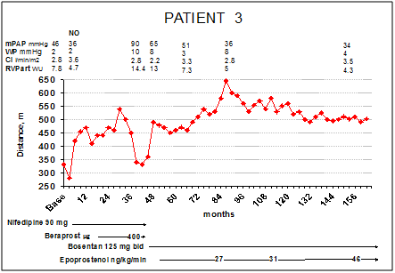 Pulmonary arterial hypertension (PAH) is a progressive disease characterized by an increase in pulmonary vascular resistance (PVR) and pulmonary arterial pressure (PAP) leading to right ventricular failure and ultimately death.1 The past decade has witnessed major advances in PAH management, due to the introduction of specific therapies. Furthermore, oral drugs have been available in the last decade consenting a more wide treatment of the disease among clinicians’ community. ET (endothelin)-receptor antagonists and PDE-5 (phosphodiesterase-5) inhibitors showed to improve exercise capacity, NYHA functional class, hemodynamics and progression of disease in several clinical trials.2–6 However, many patients have clinical worsening during oral treatment. Thus, addition of prostanoids represents an important chance to reach clinical improvement for these patients. During a 16-year period of activity in our referral center we treated almost 500 severe PH patients, and near 100 patients were exposed to parenteral prostanoids. In this paper we describe the clinical course of 3 long-term survivor patients (>10years), as they could be considered to have had an exceptional good response to treatment.