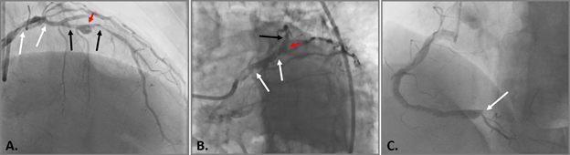 A. and B. 80% calcified stenosis in the terminal LCA and proximal LAD segment (white arrows), 90% calcified stenosis in the middle LAD segment (black arrows) and aneurysm in the middle LAD segment with a diameter of up to 6 mm (red arrow); C. RCA is diffusely changed, expanded throughout up to 5-6 mm; VZV is occluded from the orifice (white arrow).