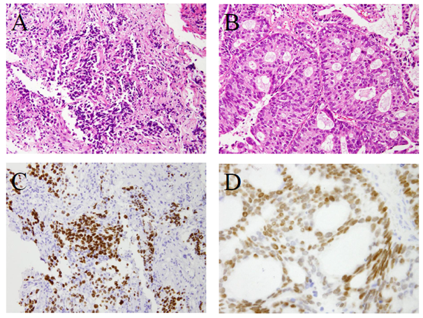 Lung cancer in the Hematoxilin-eosin (HE) stain showed a proliferation of atypical cells composed of a high nucleo-cytoplasmic ratio. This was low differentiated adenocarcinoma (A). An intradural-extramedullary tumor in the HE stain showed that atypical epithelial cells proliferated. This was moderately differentiated adenocarcinoma (B). The antibody to thyroid transcription factor-1 (TTF-1) is a specific marker for lung adenocarcinoma and thyroid cancer. Both lung cancer and THE intradural-extramedullary tumor showed positive immunohistochemical staining for TTF-1 (C, D). The intradural-extramedullary tumor was diagnosed as a metastatic tumor from lung adenocarcinoma. Magnified 400times.