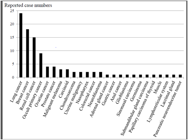 Lung cancer was 24 cases,4,5,9,15,22,31,51,55,56,59,63,67 present case. Breast cancer was 18 cases.4, 5,7,8,11,13,14,16,22,24,41,57,61 Renal cell cancer (including Wilm’s tumor and Grawitz tumor) was 15 cases.25,27,35,38,43,45–47,49,52,54,58,64–66 Occult primary cancer was 9 cases.10,13,14,16,17,22, 24,26,31 Ovarian cancer was 4 cases19,31,32,39 Prostate cancer was 4 cases.26,34,44,68 Malignant melanoma was three cases.4,18 Carcinoid was three cases.23,33,48 Chondrosarcoma was two cases.28,53 Uterine malignancy was two cases.4,20 Nasopharynx was two cases.21,31 Colorectal cancer was two cases.12,22 Neuroblastoma was two cases.13,60 There was once case each of adrenal gland cancer,6 gastric cancer,29 anal cancer,30 glioblastoma,36 sinonasal carcinoma,37 germinoma,40 submandibular gland carcinoma,82 papillary carcinoma of the thyroid,62 muscle,31 lymphoreticular system,31 lacrimal gland,31 and a pancreatic neuroendocrine tumor.69