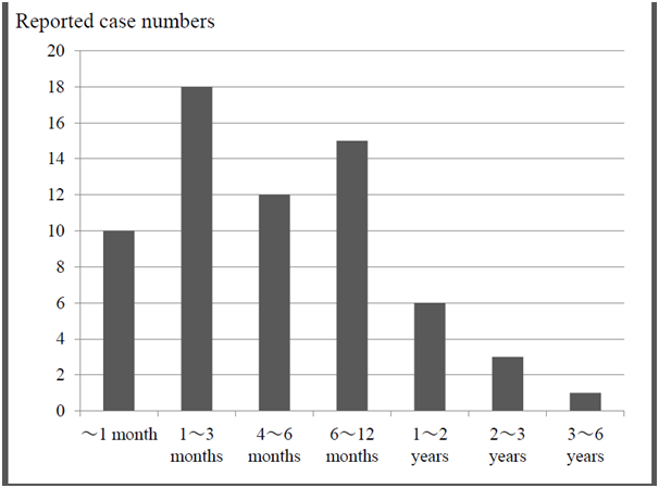 According to previous reports, the main primary tumors of intradural-extramedullary metastasis were lung cancer (24cases including ours), breast cancer (18cases) and renal cell carcinoma (15cases) (Figure 5).4–69 The average life expectancy of an intradural-extramedullary metastasis was 110days in lung cancer and more than one year in renal cell carcinoma.3,62 These reports were limited to each primary tumor. However, the primary tumor cannot be diagnosed before surgery and we need the general life expectancy for treatment. The general life expectancy of an unfamiliar condition, intradural-extramedullary metastasis, is still unknown. Therefore, we examined the postoperative life expectancy of all 65 cases, 64 cases previously reported plus the present case.5,6,8,10–14,16-18, 22, 24, 26–32,34,36–38,41,44–46,48,50–52,54,55,58,60–65,67–69 We excluded articles that had no description or a vague description about life expectancy. In cases where patients were alive at the last examination, we calculated as over the time until the last examination. We calculated one month as four weeks. The average life expectancy was more than 8.6months (1week~more than 63months) (Figure 6). The life expectancy of an intradural-extramedullary metastasis was considered to be not so long.