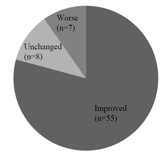 Most reports about an intradural-extramedullary metastasis were case reports. Postoperative functions were reported in various ways and were not uniform so the general surgical results were unknown. According to Chow et al.,31 we evaluated the surgical results of each report by simple three grades, improved, unchanged, or worse. We defined the percentage of functional improvement as the number of improved cases divided by the total number of cases×100. We reviewed a total of 70 patients, 69 cases with descriptions about the postoperative function plus the present case.5,6,8,10,11,13,14,16–18,20,21,23–36,28–35,37–49,51,52,54,55,57,60–62,64–66,68,69 A total of 55 cases were improved (Figure 7). The overall functional improvement rate was 78%. An intradural-extramedullary metastatic tumor was expected to improve following surgery regardless of the primary tumor.