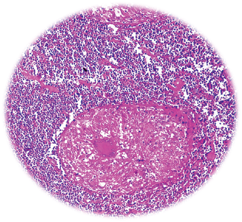 The investigations showed Hb-12.1gm/dl, ESR-45mm 1st hour, total leucocyte count-8700/mm3, differential leukocyte count: neutrophil(63%), lymphocytes(27%), eosinophils(5%), monocytes(4%), and basophils(1%). Biochemical investigations showed Fasting blood glucose-98.0mg/dl, blood urea-30.8mg/dl, serum creatinine-1.1mg/dl, serum bilirubin-0.8mg/dl, AST-34.0 IU/L, ALT-32.3IU/L, Alkaline phosphatase-100.8IU/L. Viral markers for HIV, HBSAg, and HCV was found to be negative. Radiography of Chest showed left sided pleural effusion. Radiography of thoracolumbar spine did not show any abnormality. Fistulo gram delineated the tract which was directed upwards posteromedialy. Fine needle aspiration cytology (FNAC) of right inguinal lymph node showed granular necrotic material with few lymphocytes highly suspicious of tuberculosis. MRI of thoracic spine (T2WI) showed a nodular hyperintense intramedullary lesion at T4 vertebral segment with surrounding hyperintense edema extending from T2to T6 vertebral level (Figure 1). With T1 contrast isointense lesion at D4 vertebral segment showed thick ring enhancement. Colonoscopy also showed a large ulcer in the lower part of rectum suggestive of Tuberculosis (Figure 2). The histology of biopsy material taken from perianal lesion showed caseating necrosis, epithelioid cells with Langhan’s type multinucleated giant cells suggestive of Tuberculosis (Figure 3).