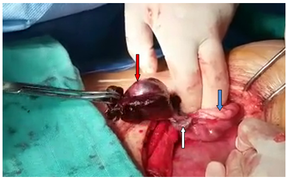 Figure 1 Per operative view. White arrow, the pedicle torsion of the right Fallopian tube; Blue arrow, normal right ovary; Red arrow, the gangrenous fallopian tube