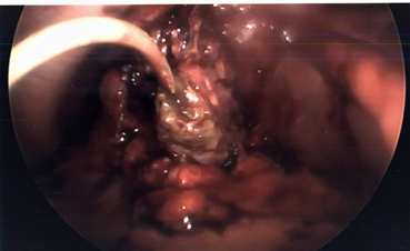 Patient was readmitted about 6 weeks later with acute changes in mental status, secondary to acute aspiration pneumonia. He developed bilateral pleural effusions and had a right-sided thoracocentesis performed. Around this time, his IR cholecystostomy drain fell out, and his liver function tests started to trend up - suggestive of ongoing acute on chronic cholecystitis. He underwent an ultrasound scan at this time which failed to visualize the gallbladder due to extensive distention of bowel gas shadows. Hence IR could not reposition the percutaneous drain. He was therefore taken to the operating room for planned laparoscopic cholecystectomy, after his acute medical condition was stabilized. Intraoperatively, there were extensive dense adhesions around the gallbladder. The gallbladder itself appeared thickened, contracted and was very friable (Figure 1). Attempt to dissect the cystic duct and cystic artery was deemed unsafe due to the significant adhesions and poor tissue friability. Hence decided to perform LCtube placement. A 12 French Foley catheter was inserted through one of the 5 mm port sites and placed into the fundus of the gallbladder. The balloon was then inflated within the gallbladder to secure it in place (Figure 2). A Jackson Pratt (JP) drain was inserted adjacent to it in the gallbladder fossa.