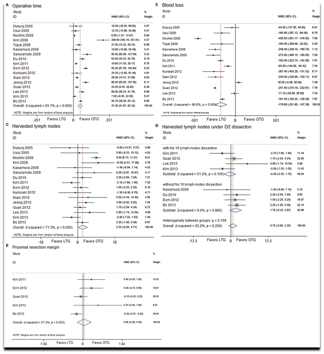 Gastric cancer remains the fifth cause of related cancer death. The objective of the cure is to obtain Ro resection with negative margins to have the best prognosis. Surgical option remains the only curative choice for this disease. Open Gastrectomy was the only type of technique available until 1991 when Kitano performed the first LG followed by Goh in 1992.14–15 Since then, the laparoscopic technique has gained large consensus and several authors have reported successful results regarding laparoscopic subtotal or total gastrectomy for cancer. They demonstrated that LSG/LTG are feasible and safe techniques with important peri-operative advantages such as fewer use of analgesics; less blood loss, due to major field amplification; less acute lung injury (ALI) volume overload and less hypothermia. In addition to this, they also showed better LND, faster oral intake, reduced pain, earlier hospital discharge, the same M/M and similar anastomotic leakage or stenosis, and similar LTS-DFS-OS compared to OG. As far as port site some Author has reported negative results10–14 while other authors have noticed that the time is shorter and closer to open technique when a dedicated laparoscopic team perform at least 50 LG.4,5 Recently, Haverkamp et al. meta-analysis have showed the superiority of LG vs OG but oncological outcomes are still being debated.2,11 According to Japanese Guidelines, distal or total gastrectomy with D2 dissection improve survival. The review reported that LSG or LTG plus D2 LND is feasible and safe in the hands of experienced surgeons. With the development of the laparoscopic technique, the number of LTG use is increasing, and seven additional articles comparing the LTG to OTG have been published. There was a longer duration of operative time in the LTG group than that in the OTG group (WMD, 47.00; 95% CI, 31.67, 62.33; P, 0.001). Blood loss during the operation was decreased under the laparoscopic procedure (WMD, 2179.60; 95% CI, 2251.80, 2107.89; P, 0.001). No statistical difference was found between the two groups in the number of harvested lymph nodes (WMD, 2.33; 95% CI, 20.04, 4.71; P=0.054). The length of the proximal resection margin was similar for either groups (WMD, 0.06; 95% CI, 20.26, 0.39; P=0.706). In the subcategory analysis of postoperative complications, patients in the LTG group have showed less wound infection (RR, 0.35; 95% CI, 0.20, 0.61; P, 0.001). No statistical differences were found in anastomotic leakage, anastomotic stenosis, postoperative ileus, pneumonia, pancreatitis, intra-abdominal abscess. There were no significant differences in hospital mortality. DFS in LTG was similar to that in OTG (HR, 0.62; 95% CI, 0.30, 1.27; P=0.191) (Figure 2-3).1–3,12–20