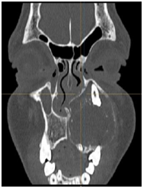 Panoramic Radiographic was obtained shows a large unilocular radiolucency on the left side of the maxilla, extending from tooth #22 to #26. Unerupted tooth #23 was present inside the lesion. Computed Tomography (Figure 2) (Figure 3) of facial bone was obtained shows well circumscribed unilocular radiolucency and radiolucency involves the crown of unerupted tooth #23. Based on the history and clinical features and radiographic evaluation dentigerous cyst and adenomatoid odontogenic tumour was made as provisional diagnosis. Other strictly radiolucent lesions worthy of consideration are keratocystic odontogenic tumor, ameloblastic fibroma, odontogenic myxoma, or central giant cell tumour as well as unicystic ameloblastoma which is common in this age.