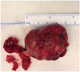 On Histologic and immune-histochemical evidences are present for the follicular variant showing that they originate from the reduced enamel epithelium of the dental follicle.12 Origin of the extra-follicular variant is less clear. Philipsen et al.,13 suggest that all the AOT variants show identical histology, have a common origin and implicate the dental lamina or its remnants. Macroscopically, AOT is surrounded by a connective tissue capsule. When dissected, it may appear as a solid mass, as seen in our case14 (Figure 5). The AOT has a distinctive histopathologic appearance, i.e. spindle-shaped epithelial cells are arranged in the form of sheets, strands or whorled masses surrounded by connective tissue stroma. These epithelial cells may form rosette-like structures with a central space, which may be empty or contain an eosinophilic amyloid- like material. The characteristic feature of AOT is the presence of duct-like structures that are surrounded by columnar cells with nuclei oriented away from the lumen. These structures are not true ducts, and no glandular elements are present in the tumour. Small foci of calci cations are scattered throughout the tumour. It may also present in the lumen of the structures.13–16