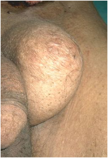 Lipoma of the cord is a poorly recognized entity that can be present with groin symptoms and clinical findings indistinguishable from inguinal hernia. Occasionally extra peritoneal fatty protrusions are often observed along the path of the spermatic cord into the inguinal canal occurring in more than one-fifth of the patients with inguinal hernia, but true Lipomas are not commonly found.2 Its incidence was poorly appreciated prior to the laparoscopic era.3 70% of spermatic cord tumors are benign, out of which spermatic cord lipoma constitutes 30-35% of benign tumors. The etiology is unknown but linked to constitutional factors like obesity. This progresses always as an asymptomatic usually unilateral extra testicular intrascrotal mass showing a swift growth to masses larger than 10cm with no other clinical symptoms or signs of tumor, frequently seen in the fifth or sixth decade of life. Rarely, spermatic cord can transform to liposarcoma.4