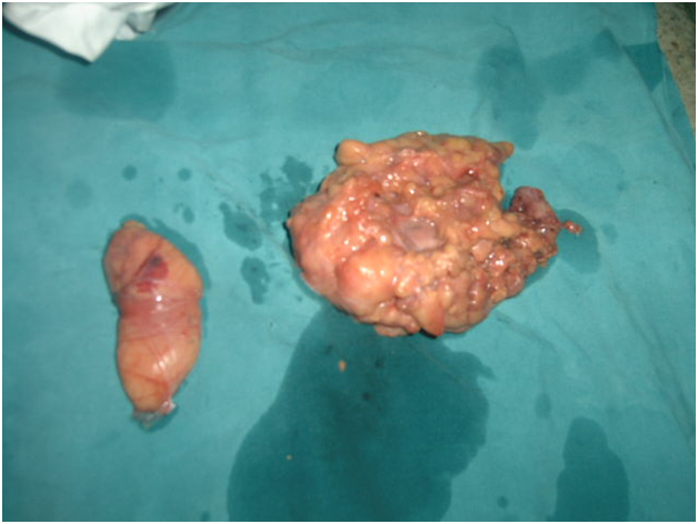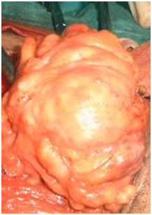 An 82year old male presented with painless swelling of right groin of 18months duration for which he was asymptomatic. General physical as well as systemic examination was normal. Local examination showed a 17×11×7.3 centimeter swelling, with thinned overlying skin, soft, non tender, with restricted mobility, having negative cough impulse and the transillumination test (Figure 1). Ultrasonography showed a hyper echoic lesin. Fine needle aspiration yielded adiposities. Patient had excision with intraoperative swelling, soft, yellowish with adhesions with adjacent structures which were easily released, weighing about 756grams (Figure 2) (Figure 3). Post operative period period was uneventful and no recurrence seen in follows up of 11months.