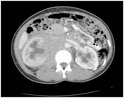 In this case it was imperative to initially treat the hydronephrosis in order to protect the kidneys and then identify the cause of obstruction by tissue biopsy. Chemotherapy and immunotherapy are the mainstay treatment in the management of lymphoma. These are not infrequently complicated by neutropenic sepsis and tumor lysis syndrome; thus, patients should be monitored closely during therapy. Lymphoma is a well-recognized complication of an immunosuppressed state and thus it was also important to determine whether there was an underlying cause in this case, especially following her examination findings.8 Indeed, diffuse large B-cell lymphoma is the commonest subtype of lymphoma to occur in HIV patients; this subtype is demonstrated in 80% cases of lymphoma in HIV patients. Prompt identification of her HIV allowed early instigation of HAART therapy to prevent the complications of HIV infection and prevention of further transmission of the virus. This case describes an example of lymphoma in an immunocompromised patient causing bilateral hydronephrosis. It highlights the importance of this differential in acute abdominal pain and kidney injury. It also demonstrates the importance of maintaining a high index of suspicion in a patient with signs of immunosuppression on clinical examination.