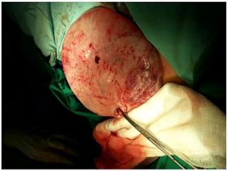 A 25year-old Primigravida at 8weeks of gestational age attended our obstetric emergency unit with lower abdominal pain that lasted for two hours in duration. She conceived spontaneously with no history of ovarian stimulation treatments. On general examination she was vitally stable. However abdominal examination revealed that a palpable mass at the middle of the lower abdomen corresponding to 20weeks in size was tender on palpation. Baselines of all investigations were within normal limit. Eventually a radiology ultrasound revealed that the gravid uterus with intra uterine alive fetus corresponding to 8weeks of gestation and a huge anechoic well defined cystic lesion in the middle of lower abdomen measuring 13.8x8.8cm with no doppler signal around it. Both ovaries were masked by the mass. Minimal amount of free fluid was seen in the pouch of Douglas. An urgent laparotomy was undertaken, during which a large unilocular thick walled right-sided ovarian cyst was detected measuring around 14x8.5cm in size (Figure 1). The cyst was twisted twice with clear fluid inside it. A right ovarian cystectomy was then carried out, and around 1700ml clear fluid aspirated from the cyst. The remaining ovarian tissue and fallopian tube were preserved. Postoperatively she was placed on oral progesterone (Tab Dydrogesterone 10mg BID) support upon hospital discharge. Histopathology report confirmed serous cyst adenoma in the ovary with signs of torsion. Tumor markers were within the normal limit. She was on regular ANC follow up which was uneventful. At 40weeks and 1day of gestation she delivered by a spontaneous vaginal delivery of a live baby of weighting 3kg with Apgar score 9/1minute and 10/5minute.