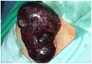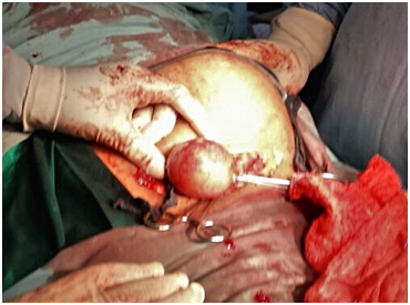 A woman who was G3P2 was admitted at the 6weeks of gestation with lower abdominal pain, which continued for 3-4hours in duration associated with vomiting. She was conceived with ovulation induction drug inview of secondary infertility. She had a history of right-sided ovarian cyst 1-yearprior, which was managed conservatively by hormones. On USG, a gravid uterus with intrauterine gestational sac and a small fetal pole was seen. A large right adnexal mass was also noticed which measures to be around 6x7cm with free fluid surrounding it, using color Doppler poor signal suggestive of the ovarian torsion. The left ovary was normal and free fluid seen in the POD. We performed an emergency laparotomy. A gangrenous right ovarian cyst was observed measuring 6x7 (Figure 2) and right salpingo-oophorectomy was performed. Histopathology analysis revealed haemorrhagic gangrenous cyst. Postoperatively the patient received tocolysis as mentioned. She was discharged at the 4th postoperative day and had an uneventful pregnancy course. At 40weeks of gestation she had an emergency C/S inview of fetal distress and delivered an alive baby with birth weight of 3.3kg and Apgar scores of 8 and 10 at 1minute and at 5, respect minutes after birth.