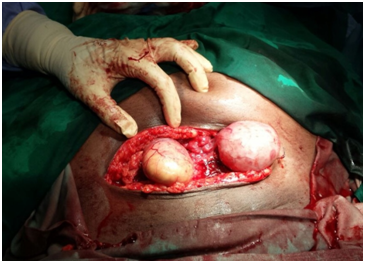 A female that was 39years of age G3P2 was admitted at 38weeks for planned cesarean section (CS) inview of previous history of 2 CS. She underwent cesarean section and delivered a healthy live baby with weight of 3.2kg and the Apgar scores measured at 1min and 5min was 9 and 10 respectively. Bilateral ovarian cyst that was observed measured 5x4cm on the right side and 5x5cm on the left side (Figure 4). So Bilateral ovarian cystectomy was performed. Histopathology revealed bilateral mature cystic teratoma.