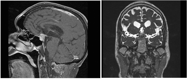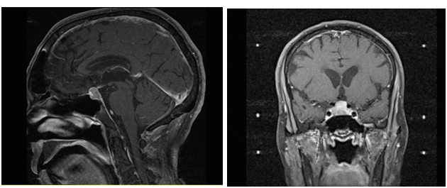 Figure 1 A) Pre-Gamma Knife T1 Weighed MRI (Sagittal View); B) Pre-Gamma Knife T1 Weighed MRI (Coronal View).