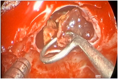 Three months later the patient presented acutely with complaints of headache, nausea/vomiting, altered mental status and diplopia. Physical examination revealed bitemporalhemianopsia and CNIII palsy. Laboratory and imaging workup revealed panhypopituitarism and a 1.7cmx1.9cm contrast enhancing surpasellar hemorrhagic mass impinging on the optic chiasm with extension into the cavernous sinuses R>L (Figure 2). Treatment options were discussed and the patient chose to undergo surgery for resection of the macroadenoma. The patient successively underwent Endoscopic Endonasal Transphenoid Resection of the Pituitary Adenoma (Insert surgical protocol) (Figure 3). Post-operatively, the patient had no major complications or focal motor or sensory neurological deficits. Patient noticed immediate improvement in his peripheral vision with marked resolution of CN III palsy several days post-op. Patient had no complications, clear rhinorrhea, or infection. Patient was placed on hormone replacement therapy (with Hydrocortisone, Synthroid and Vasopressin) due to his panhypopituitarism from pituitary apoplexy.