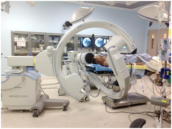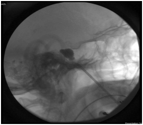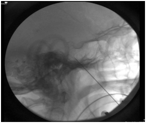 Patient presented to ER with a shooting, uncontrollable facial pain. Percutaneous balloon compression of the trigeminal ganglion was performed (Figure 2). After surgery, the patient had complete resolution of their pain, but later suffered a mild atypical facial pain 5/10 in the distribution of the V3. She was placed back on medical therapy with oxcarbazepine and pregabalin. Eight months post-balloon compression, the patient had gradually improved pain control.