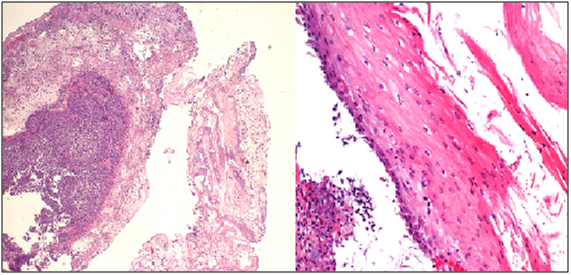 A 46 year-old male with end stage renal disease underwent deceased donor kidney transplant followed by immunosuppression with MMF, tacrolimus, and prednisone. Shortly after transplantation, he noted new solid food intermittent dysphagia with slow progression over 6 months. He was later hospitalized with progressive worsening of nausea, vomiting and dysphagia. Esophagogastroduodenoscopy (EGD) showed LA Class D esophagitis about 10 cm above the gastro-esophageal junction with a stenosisat 30cm from the incisors. Biopsies showed acute and chronic inflammation without increased eosinophils or evidence of Barrett’s mucosa. Stains for fungi, cytomegalovirus (CMV) and herpesvirus (HSV) were negative. He was treated with esomeprazole 40mg twice a day but was re-hospitalized one month later with persistent symptoms. A repeat EGD demonstrated once again LA Class D esophagitis with worsening stricture in the proximal part of the lower third of the esophagus along with candida plaques. Biopsies revealed severe esophagitis without CMV/HSV (Figure 1). The stricture was dilated up to 44 Fusing Maloney dilators and fluconazole and nystatin were added to his proton pump inhibitor (PPI).