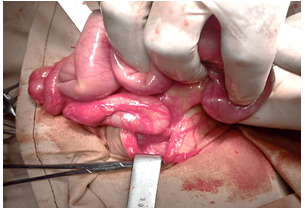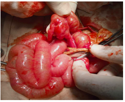 The examination made it possible to objectify a general bad impression with an asthenic child; a subictere; an epigastric arch on a painless supple depressible abdomen with the omphalocele on the way to epidemization. On digital rectal examination, the rectal bulb was empty. The diagnosis of neonatal occlusion on omphalocele was made. The newborn was taken to the operating room for an exploratory laparotomy. Under general anesthesia plus orotracheal intubation, installation in the dorsal decubitus position, warmed newborn, a transverse supra-umbilical incision is made according to Bianchi. At the coeliotomy, we objective: a tight neck of 4cm with a sac containing the ascending colon and the strangulated caeco-appendix at the level of the neck (Figure 1). We proceed to the reduction of the handles. Exploration of the abdomen made it possible to note an incomplete common mesentery loop arrangement (Figure 2). An appendectomy is performed and then the loops are placed in the complete common mesentery according to the LADD procedure; closure of the abdominal cavity, shot by shot after resection of the hernial sac and closure of the neck.