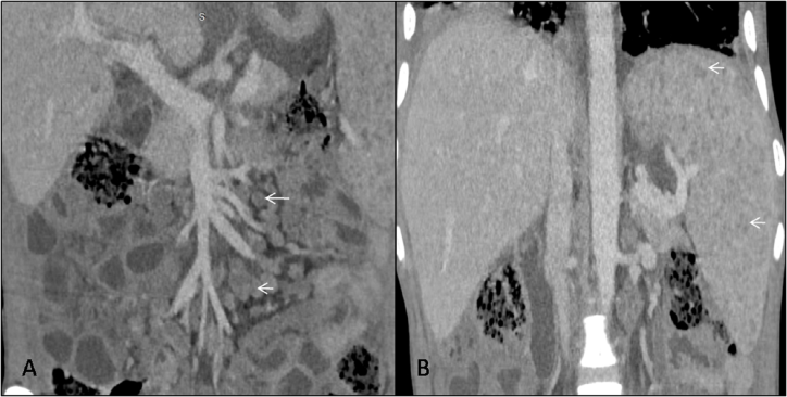 Figure 1 Contrast enhanced computed tomography scan, venous phase in coronal plane, (A) shows multiple conglomerated, peripherally enhancing lymph nodes with central low attenuation in mesentery adjacent to mesenteric vessels (white arrow). (B) shows mild enlargement of the liver and spleen (craniocaudal length measures approx 17cm and 16cm respectively). Numerous tiny hypodense peripherally enhancing lesions are seen diffusely scattered insplenicparenchyma (white arrow).