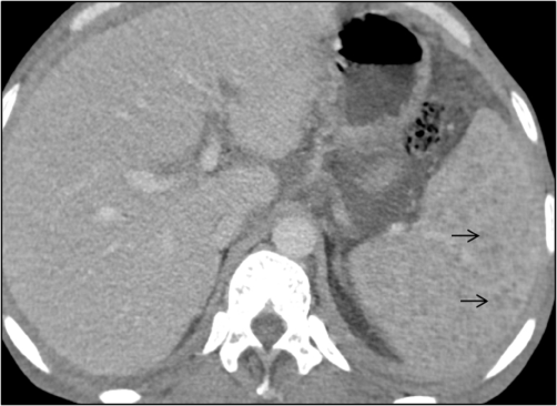 Figure 2 Contrast enhanced computed tomography scan, venous phase in axial plane shows numerous tiny hypodense peripherally enhancing lesions diffusely scattered in splenic parenchyma consistent with tubercular micro abscesses (black arrows).