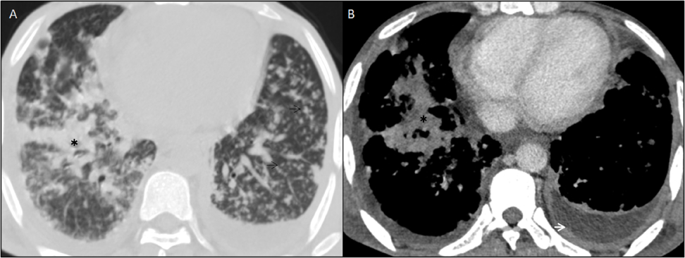 Figure 3 CECT of bilateral lower hemithorax in axial planes (A) Lung window, shows multiple tiny centrilobular nodular opacities in bilateral lung fields (black arrows) forming “tree-in-bud appearance” and patchy consolidation in right lower lobe (black asterisk) signifies active pulmonary tuberculosis. (B) Soft tissue window reveals thickened and enhancing left pleural linings with fluid collection in pleural space forming “split pleura sign” suggesting empyema.
