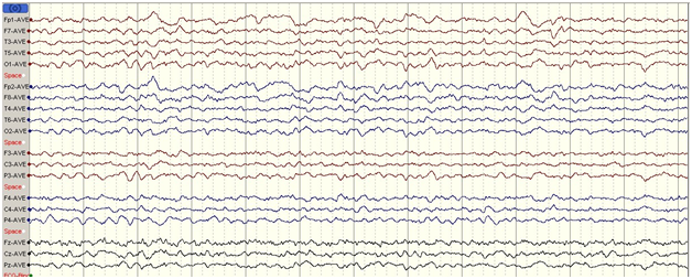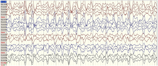 Rapid skin decontamination as well as, nasogastric wash was done, 2mg atropine was given and pralidoxime started for the fasciculation. The Patient started to improve, heart rate increased, bronchorrhea disappeared and fasciculation stopped. We observed sudden deterioration in her level of consciousness. Patient’s examination about 12hours after admission revealed Glasgow Coma Scale (GCS) with no eye opening, flexion bilateral and no sounds (GCS 5) indicating intubation and initiation of mechanical ventilation. Her blood gases was adequate and hypoxic index was 350 with saturation 98% on the pulse oximeter, no fasciculation was noticed but the pupils were still bilaterally constricted and no bronchorrhea. CT brain was done and was unremarkable. No clinical seizures occurred since her admission and her GCS was still 5. Other neurological examination showed normal tendon reflexes, adequate muscle tone in both upper and lower limbs and no involuntary movements noticed along her stay in intensive care unit (ICU). We ordered EEG and was done in the second day of her admission revealed bilateral symmetrical sharp waves 2-3cycles/minutes and followed by rhythmic delta activity that was suggestive for non-convulsive status epilepticus.