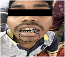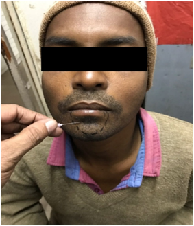 A 38years old male with known history of sickle cell disease presented with numbness of chin, lower lip, and gingival mucosa in between two lower canine teeth (Figure 1). Dental sensation, upper lips, and other part of buccal mucosa sensations were intact. He had prior history of admission to our hospital 1month back for painful crises and diagnosed as sickle cell disease by sickling slide test and Hb electrophoresis. His neurological examination revealed no abnormality in other parts of the body. Investigations showed, Hb.-6.1gm%, total leucocyte count 21800per mm3 with neutrophil 84%, Total platelet count 1.84 lacs per mm3. All other laboratory investigations were within normal limit. Radiological imaging including CT scan and MRI scan showed no specific abnormality.