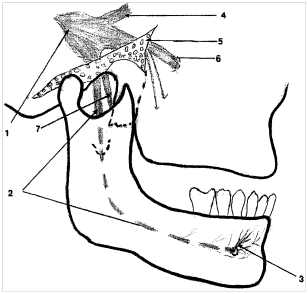 Figure 4 View of the mental nerve from the gasserian ganglion. (1) To the alveolar nerve. (2) And the mental nerve. (3) The mandibular nerveexits the base of the skull via the foramen ovale through the sphenoid. (4) Ophthalmic nerve. (5) The posterior trunk divides and gives the lingual. (6) Maxillary nerve. (7) And The inferior alveolar nerve enters the mandibular canal in the mandible and the mental nerve emerges from the mandibular foramen, at the level of the canine teeth.