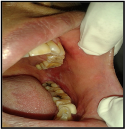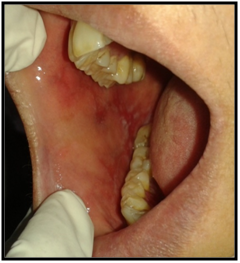 On intraoral examination, diffuse lesions in the form of erythematous areas were seen interspersed within white keratotic areas present all over the facial aspect of gingiva (Figure 2) and more posteriorly on the buccal mucosae bilaterally (Figure 3). Left buccal mucosa showed a white erythematous patch measuring approximately 2x2.5cms extending anteroposteriorly from the area adjacent to mandibular first molar to the retro molar pad area and superior inferiorly from the line of occlusion to the upper and lower lingual vestibule. White radiating striae (wickhamstriae) were present with an interspersed erythematous patch. Right buccal mucosa showed a more extensive lesion measuring approximately 2.5x3cms extending anteroposteriorly from the region adjacent to mandibular canine to the retromolar pad area and superioinferiorly from the upper gingiva buccal sulcus to the lower gingivobuccal sulcus and the alveolar mucosa. Borders of the lesion appear irregular and ill defined. On palpation, the lesions appeared to be tender. The surface of the lesions were rough and non scrapable with no induration noted.