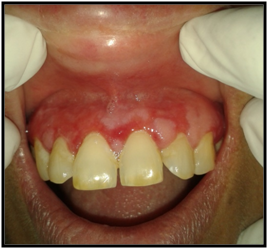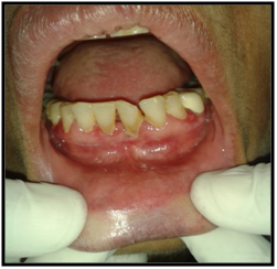 On hard tissue examination, all complements of teeth were present in all the 4 quadrants except 46, with generalized attrition and a thick band of local deposits of plaque and calculus. Mobility was absent and occlusion was angle’s class I molar relationship bilaterally. Few carious teeth were also elicited which showed no symptoms like pain, swelling or tenderness. Based on the patient’s history and clinical findings, the lesion was provisionally diagnosed as Oral Erosive Lichen Planus on facial gingivae and buccal mucosae bilaterally.