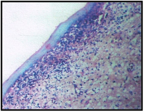 The histopathological examination of the tissue biopsied revealed it to be case of lichen planus. The hematoxylin and eosin stained section showed epithelium and connective tissue. The epithelium was parakeratinized stratified squamous and hyperplastic in few areas. Few areas also showed atrophic epithelium. Underlying connective tissue showed a dense band of chronic inflammatory cells predominantly lymphocytes along with plasma cells. Prominent blood vessels were seen in the section. Saw tooth rete pegs, which are the hallmarks of lichen planus were clearly evident in the photomicrographs .