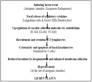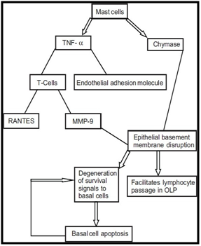 There are many antigen-specific mechanisms may be involved in the pathogenesis of OLP, including MHC class I- and MHC class II-restricted antigen presentation by lesional keratinocytes, activation of antigen-specific CD4+ helper T-cells and CD8+ cytotoxic T-cells, clonal expansion of antigen-specific T-cells, and keratinocyte apoptosis triggered by antigen-specific CD8+ cytotoxic T-cells. Apart from there are many non-specific mechanisms may be involved in the pathogenesis of OLP, including (Figure 5) The Heat Shock Proteins (HSPs), reactive oxygen species (ROS), stress, mast cell chemotaxis and degranulation stimulated by T-cell RANTES, endothelial cell adhesion molecule expression stimulated by mast cell TNF-a, T-cell MMP-9 activation by mast cell chymase, epithelial basement membrane disruption by mast cell proteases or T-cell MMP-9, keratinocyte apoptosis triggered by epithelial basement membrane disruption, intra-epithelial CD8+ T-cell migration through basement membrane breaks, inflammatory cell survival prolonged by T-cell RANTES and non-specific T-cell recruitment by keratinocyte-derived chemokines.5,6