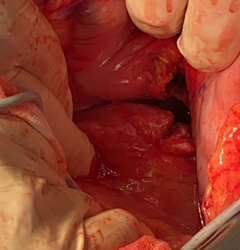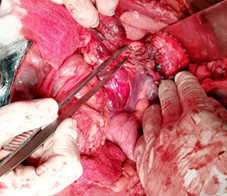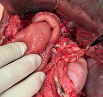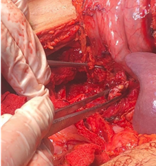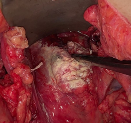 Figure 3 GIV pancreatic lesion, complete section at the level of the pancreatic neck with ductal lesion, due to blunt trauma in a polytraumatized patient.